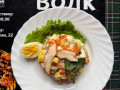 Курица,картофель,огурцы маринованные,яйцо,горошек,морковь,соус